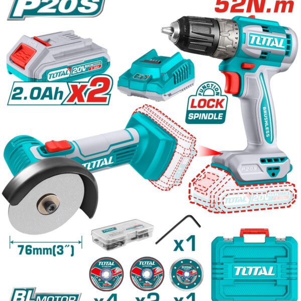4/1*TCKLI20271_طقم كومبو 20فولت 2قطعة 2بطارية 2امبير شنيور ومفك 2/1″ توتال