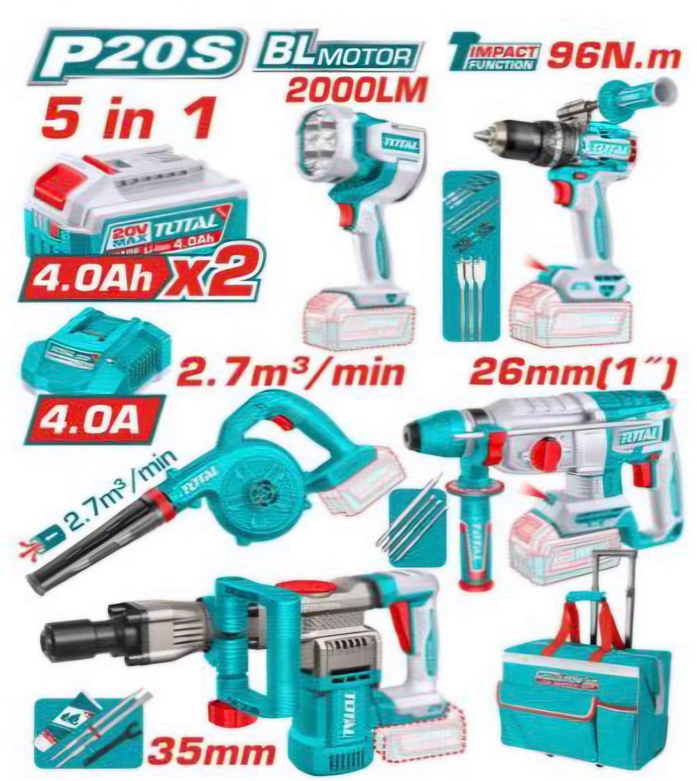 طقم كومبو 20فولت 5قطع 2بطارية 4امبير شنيور 96نيوتن هلتى 26مم بلاور هلتى تكسير كشاف شنطة تروللى بعجل TOSLI251083