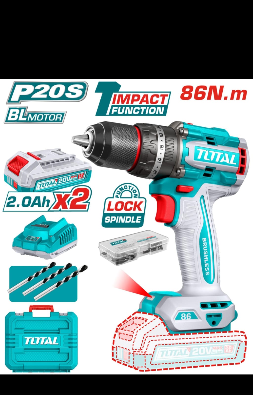 TIDLI208687_شنيور 20فولت 13مم 2بطارية 2امبير 86نيوتن دقاق توتال